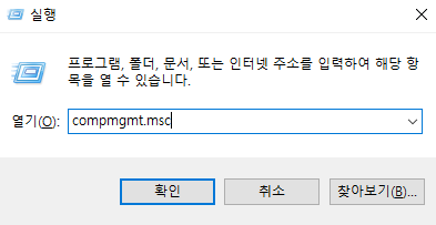 1. "윈도우키 + R" 을 누른후 compmgmt.msc 를 입력후 확인을 누른다