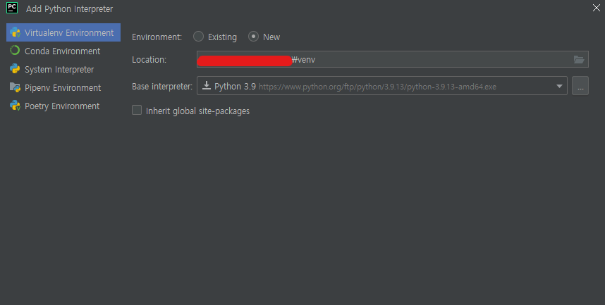 Local 에 python이 설치 되어 있더라도, 이미 설치된 python을 Base interpreter로 지정하면 pycharm과 python 간의 버젼 문제로 정상적인 interpreter 설정이 이루어질 수 없는 문제가 발생할 수 있다.