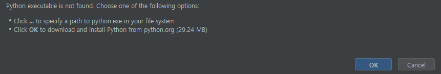 이 부분이 중요한데, 아래 캡쳐 화면처럼 "Base Interpreter" 부분을 설정한후 OK를 눌러야한다.